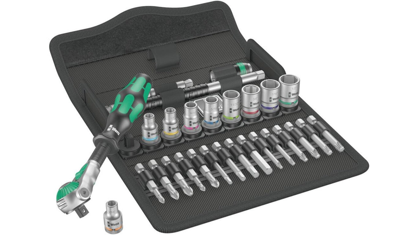 Incredibly compact set arrangement with many tools in a minimum of space. A completely new ratchet set feeling thanks to the unique textile boxes that are very robust and durable. They can be positioned upright for tidy storage on the workshop shelf. Additional surface protection due to textile outer material. Low weight and volume for simpler mobility. "Take it easy" Tool Finder with colour coding according to sizes.
