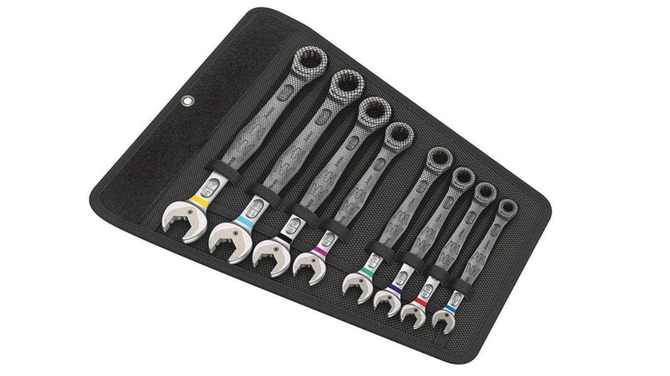 High quality combination ratchet wrench set by Wera: everything that a wrench has to be able to do. And a whole lot more. Faster, better, stylish. Yes, a real Joker. The new generation of combination ratchet wrenches. 8-piece set with imperial sizes in a robust pouch. Suitable for hexagon bolt heads or nuts. Comes with a holding function, thanks to the metal plate in the jaw, which reduces the risk of dropping nuts and bolts. The replaceable metal plate in the jaw secures nuts and bolts with its extra hard teeth and limits the danger of slipping. The integrated limit stop prevents any slipping down around the bolt head and allows higher torque to be applied. The double-hex geometry makes for a positive connection with nuts or bolts and reduces the risk of slipping. A return angle of only 30° at the open end prevents any time consuming flipping of the wrench during fastening jobs. The ratchet mechanism at the ring end, with an exceptional, fine-tooth mechanism - 80 teeth in all - enables flexibility even in very confined working spaces. The specially forged geometry provides for high torque transfer and strength. Manufactured out of high performance chrome molybdenum steel with a nickel-chrome coating for high corrosion protection. "Take it easy" Tool Finder with colour coding according to sizes.