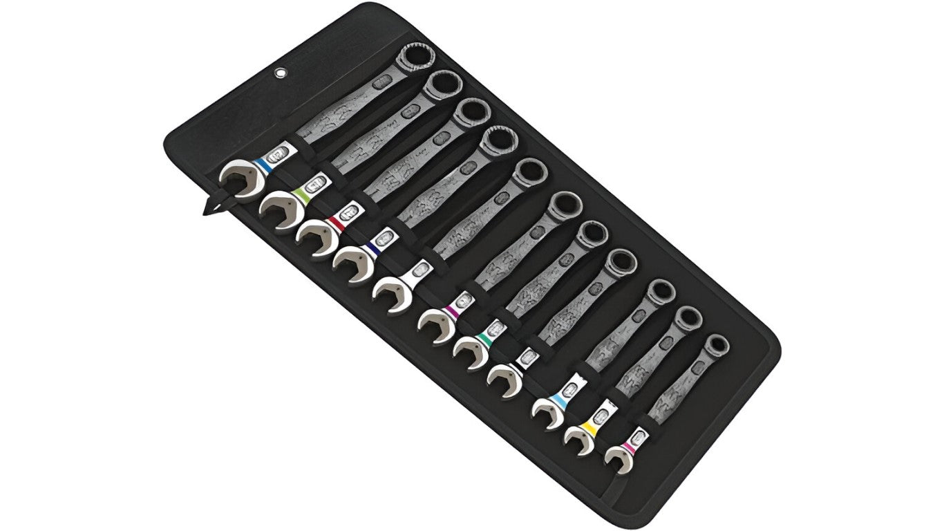 High quality combination ratchet wrench set by Wera: everything that a wrench has to be able to do. And a whole lot more. Faster, better, stylish. Yes, a real Joker. The new generation of combination ratchet wrenches. 11-piece set in a robust pouch. Suitable for hexagon bolt heads or nuts. Comes with a holding function, thanks to the metal plate in the jaw, which reduces the risk of dropping nuts and bolts. The replaceable metal plate in the jaw secures nuts and bolts with its extra hard teeth and limits the danger of slipping. The integrated limit stop prevents any slipping down around the bolt head and allows higher torque to be applied. The double-hex geometry makes for a positive connection with nuts or bolts and reduces the risk of slipping. A return angle of only 30° at the open end prevents any time consuming flipping of the wrench during fastening jobs. The ratchet mechanism at the ring end, with an exceptional, fine-tooth mechanism - 80 teeth in all - enables flexibility even in very confined working spaces. The specially forged geometry provides for high torque transfer and strength. Manufactured out of high performance chrome molybdenum steel with a nickel-chrome coating for high corrosion protection. "Take it easy" Tool Finder with colour coding according to sizes.
