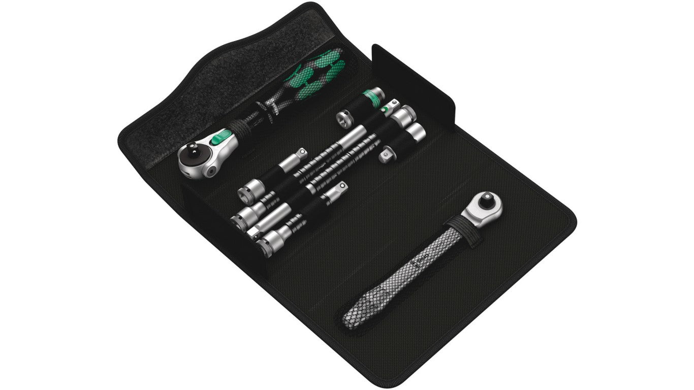 Compact Ratchet set with 2 ¼" ratchets, Zyklop Speed and Zyklop Metal with switchover lever as well as 6 accessories. Zyklop Speed ratchet with flywheel design and easy-to-grip, free-turning sleeve for high working speeds; freely pivoting ratchet head; predefined locking at 0° and 90° to the left and right as well as 15° from 90° inwards; can be used as a conventional screwdriver in its 0° position; secure locking of the sockets also in the screwdriving position; left/right switchover; fine-toothing; small return angle of 5°; multi-component Kraftform handle for low-fatigue working. Zyklop Metal ratchet with switchover lever; Zyklop Metal ratchet with switchover lever; slim design for work in even very confined spaces; the 72 fine-pitched teeth allow a small return angle of 5°; switchover lever for convenient direction change; secure socket locking function; forged, full metal ratchet (chrome-molybdenum steel) for particularly high robustness and long service life; incredibly compact arrangement: many tools in a minimum of space; extremely compact textile box that is very robust and durable; can be positioned upright in workshop shelf for tidy storage; can be set down on sensitive surfaces thanks to the textile outer material; low weight and volume for simplified mobility.