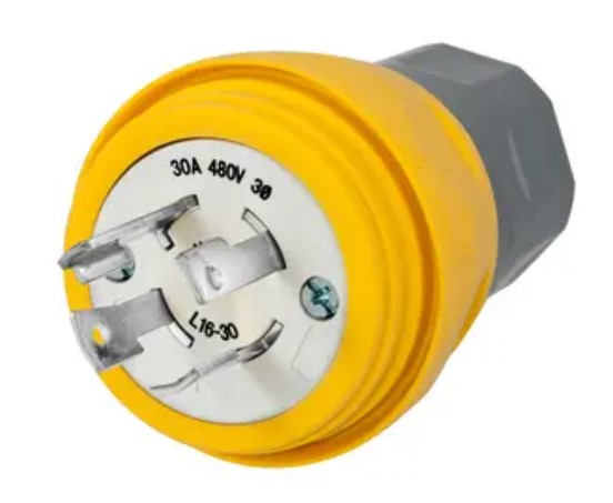 Watertight Devices, Locking Devices, Elastomeric, Male Plug, 30A 3-Phase Delta 480V AC, 3-Pole 4-Wire Grounding, L16-30P, Screw Terminal, Yellow, Water/Dust-Tight Housing