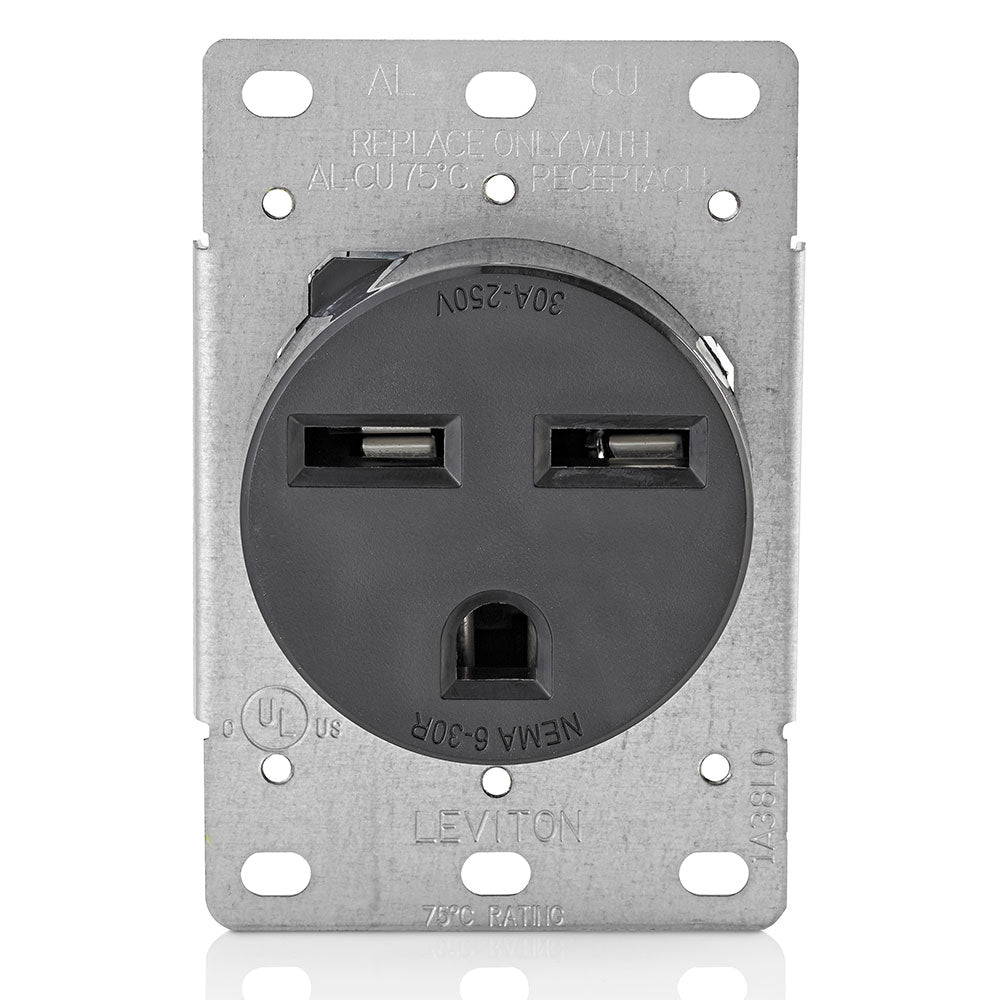 30 Amp, 250 Volt, NEMA 6-30R, 2P, 3W, Flush Mtg Receptacle, Straight Blade, Industrial Grade, Grounding, , Side Wired, Steel Strap, - Black