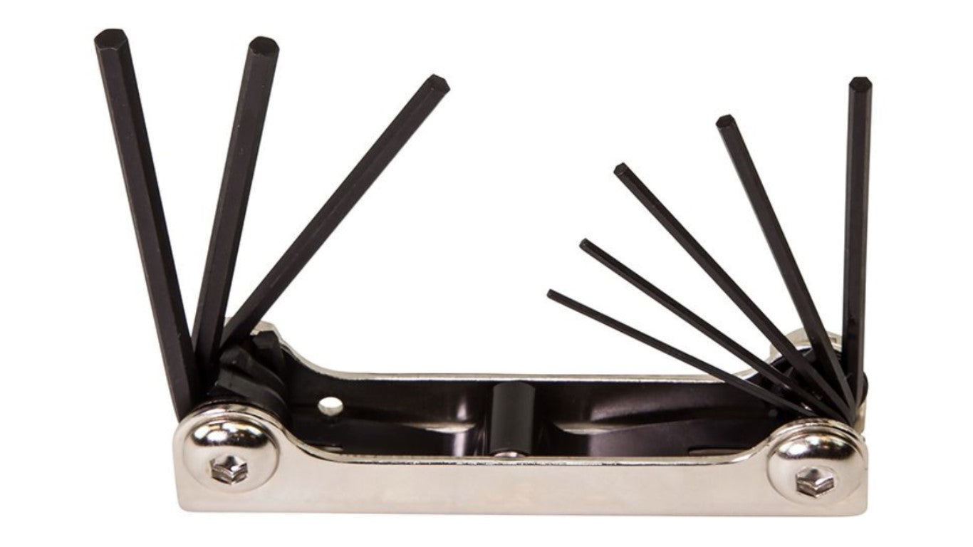- Folding Hex Keys with two key positions (straight-out or right angle) for extra leverage