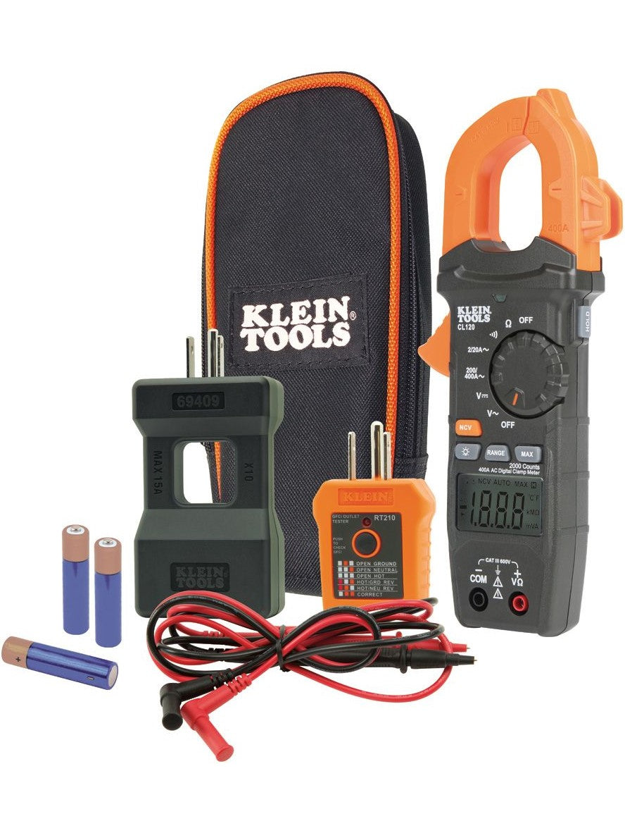 Klein Tools Clamp Meter Electrical Test Kit includes the CL110 400A Auto-Ranging Digital Clamp Meter, RT210 GFCI Receptacle Tester and 69409 Line Splitter 10x. The Electrical Test Kit allows for easy testing of live circuits and measuring of current and voltage. Included is a carrying pouch, test leads and batteries.