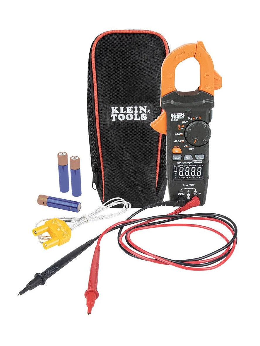 Klein Tools CL390 is an automatically ranging true root mean squared (TRMS) digital clamp meter. It measures AC/DC current and NCVT via the clamp, AC/DC voltage, DC microamps, resistance, continuity, frequency, capacitance, and diodes via test leads, and temperature via a thermocouple probe. It features a high visibility, reverse contrast LCD display that optimizes view ability both in dark or bright ambient lighting.