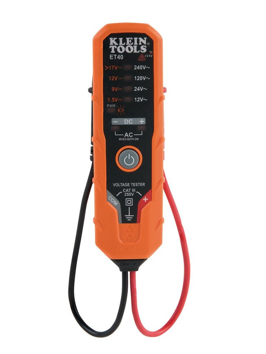 Klein Tools ET40 is an Electronic AC/DC Voltage Tester. It features indicators for positive and negative DC polarity, and tests DC voltages as low as 1.5V. It tests AC voltages 12-240VAC. Excellent for checking, verifying or troubleshooting common residential electrical wiring in electrical outlets, light fixtures, doorbells and more. It operates on 2 x AAA batteries.