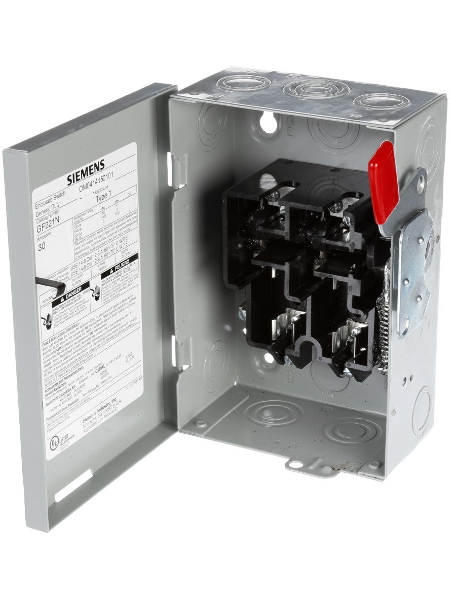 Siemens Low Voltage Circuit Protection General Duty Safety Switch. 2-Pole 2-Fuse and solid neutral Fused in a type 1 enclosure (indoor). Rated 240VAC (30A) (30 amp). Horse power (Std, Time delay) fused: 1-PH 2-W (1-1/2, 3), 3-PH 3-W (3, 7-1/2), 250VDC (5). Special features: service entrance labeled suitable for 3-PH motor loads.