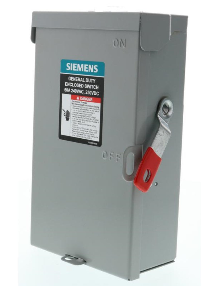 Siemens Low Voltage Circuit Protection General Duty Safety Switch. 2-Pole 2-Fuse and solid neutral Fused in a type 1 enclosure (indoor). Rated 240VAC (60A) (60 Amp). Horse power (Std, Time delay) fused: 1-PH 2-W (3, 10), 3-PH 3-W (7-1/2, 15), 250VDC (10). Special features: service entrance labeled suitable for 3-PH motor loads.