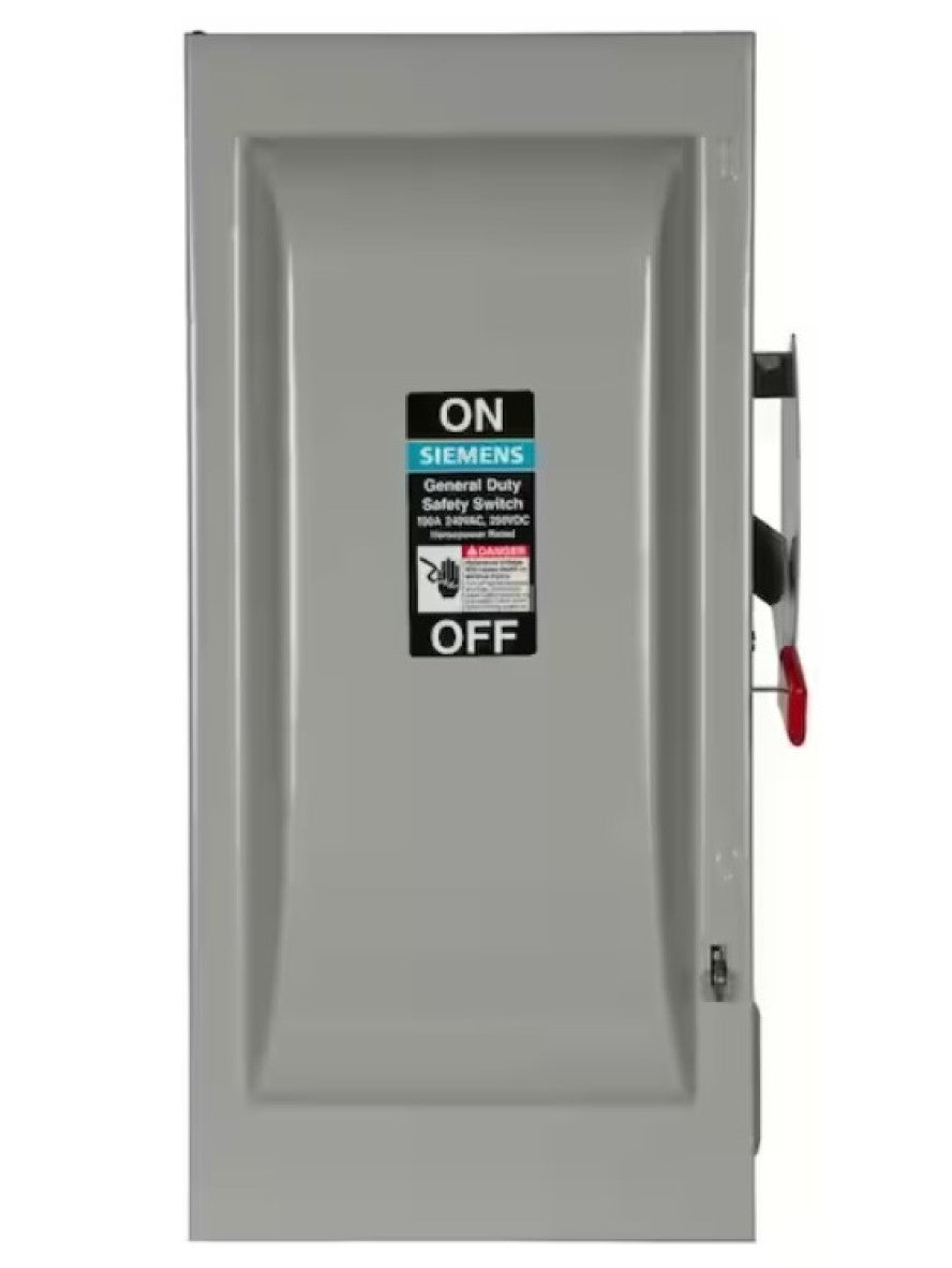 Siemens Low Voltage Circuit Protection General Duty Safety Switch. 2-Pole 2-Fuse and solid neutral Fused in a type 1 enclosure (indoor). Rated 240VAC (100A) (100 Amp). Horse power (Std, Time delay) fused: 1-PH 2-W (7-1/2, 15), 3-PH 3-W (15, 30), 250VDC (20). Special features: service entrance labeled suitable for 3-PH motor loads.