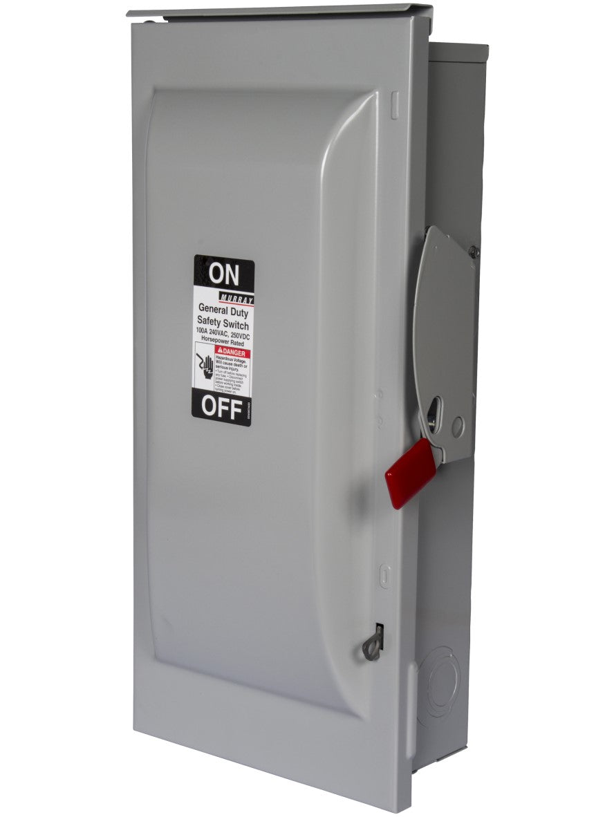 Siemens Low Voltage Circuit Protection General Duty Safety Switch. 2-Pole or 3-Pole Non-Fused in a type 3R enclosure (outdoor). Rated 240VAC (100A). Horse power: 1-PH 2-W (15), 3-PH 3-W (30), 250VDC (20). Special features: service entrance labeled suitable for 3-PH motor loads. 240 Volt, 100 Amp