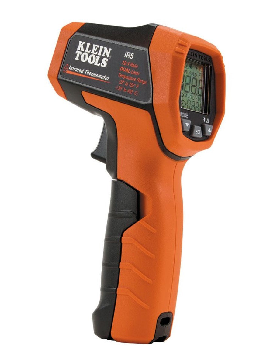 Klein Tools IR5 is a professional dual-laser targeting infrared thermometer, offering a wide measurement range, a tight 12:1 distance-to-spot ratio, dual targeting lasers, and several calculation modes to facilitate different temperature measurement applications. The dual lasers assist in targeting the measurement area. The distance between the two laser spots on the surface of the object being measured approximates the diamater of the circular measurement area from which the infrared sensor is collecting data.