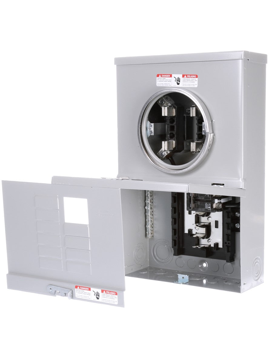 SIEMENS LOW VOLTAGE METER LOAD CENTER COMBINATION. FACTORY INSTALLED MAIN BREAKER 10 (1 INCH) SPACES INTERIOR ALLOWING MAX 20 CIRCUITS. 4-JAW METER / 1-PHASE SYSTEM RATED 100A (100 Amp). SPECIAL FEATURES: OH FEED, RING TYPE COVER, SURFACE MOUNTING