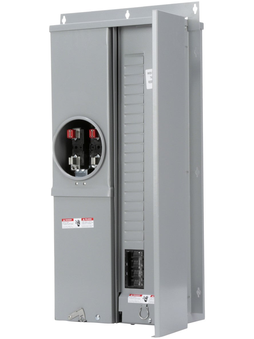 SIEMENS LOW VOLTAGE METER LOAD CENTER COMBINATION. FACTORY INSTALLED MAIN BREAKER 20 (1 INCH) SPACES INTERIOR ALLOWING MAX 40 CIRCUITS. 4-JAW METER / 1-PHASE SYSTEM RATED 200A (200 AMP). SPECIAL FEATURES: OH/UG FEED, RING TYPE COVER, FLUSH MOUNTING, EUSERC APPROVED