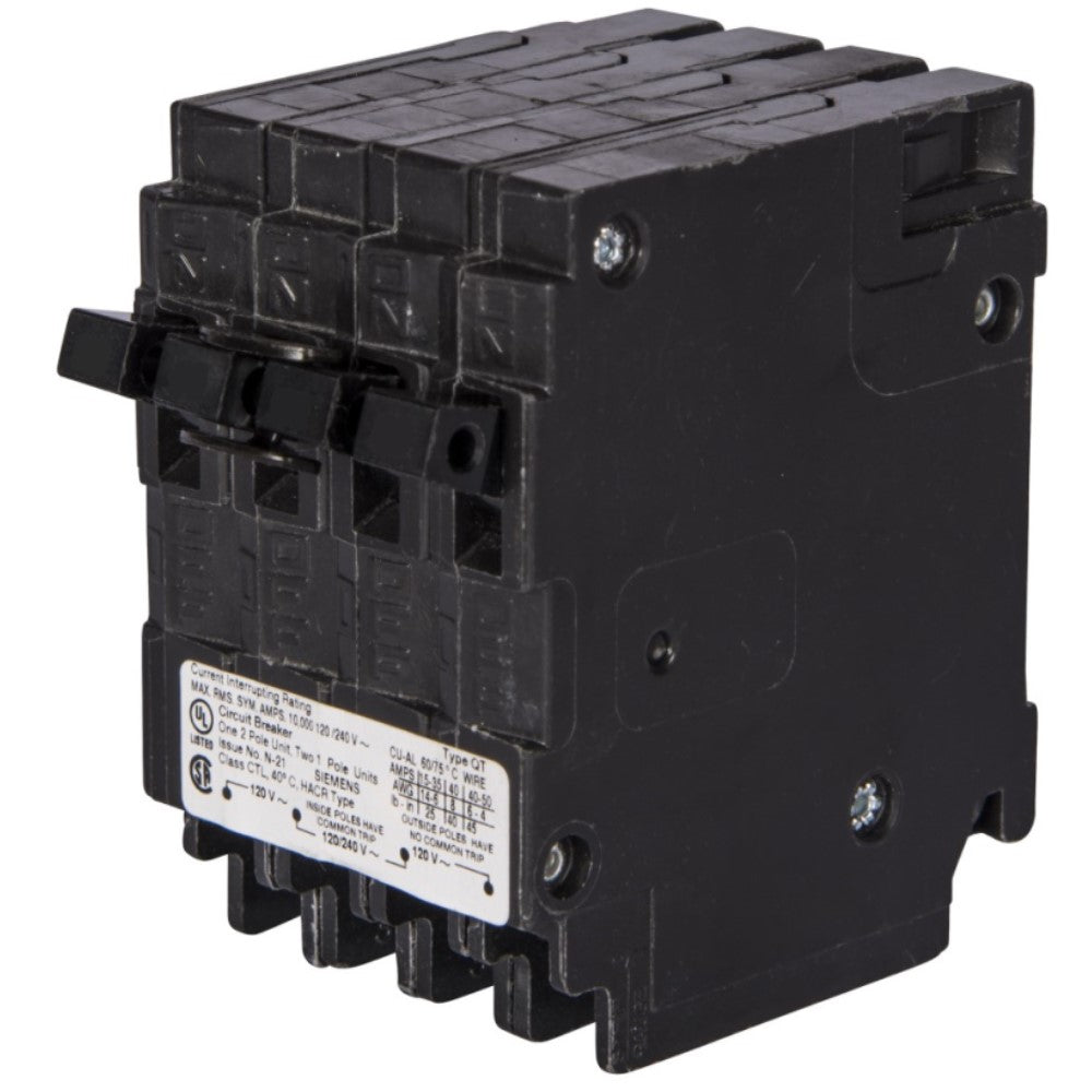 Siemens Low Voltage Residential Circuit Breakers Miniature Thermal Mag Circuit Breakers - Duplex, Triplex, Quadplex are Circuit Protection Load Center Mains, Feeders, and Miniature Circuit Breakers. Type: QT Application: Electrical Distribution Standard: UL 489 Voltage Rating: 120/240V Amperage Rating: 15-30A Trip Range: Thermal Magnetic Interrupt Rating: 10 AIC Number Of Poles: Two single poles and one double pole