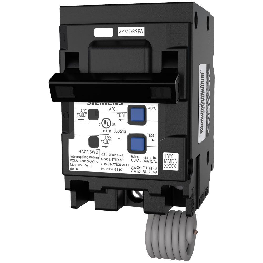 Siemens Low Voltage Residential Circuit Breakers Miniature Circuit Breakers AFCI - Combo AFCI 2-pole plug-on 10k and 22k are Circuit Protection Load Center Mains, Feeders, and Miniature Circuit Breakers. Type: Combination Type AFCI Standard: UL Listed Voltage Rating: 120/240 Amperage Rating: 20 Amp Number Of Poles: 2 Operating Temperature: 40