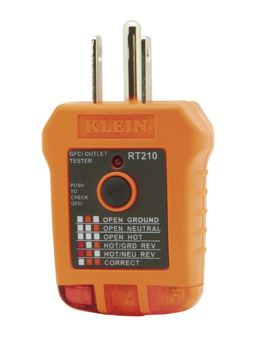 Klein Tools Receptacle Testers are designed to detect the most common wiring problems in standard and GFCI receptacles. A convenient chart on the tester helps determine wiring condition in outlet, based on LED lights results. Conditions indicated: open ground, reverse polarity, open hot, open neutral, hot/ground reversed.